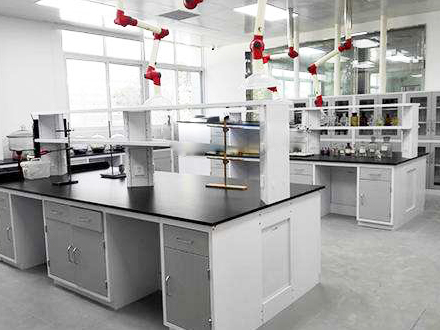 石油化工實驗室中央通常設置中央實驗臺,臺上設置試劑架,中央實驗臺的縱向側面或中間設置洗滌臺(洗滌臺設置靠近水源)。中央實驗臺的正向和縱向一側設置試驗邊臺、試劑架、組合架、吊柜等,另一側靠墻設置通風柜(通風柜的位置應便于通風管道的連接)、干燥架、藥品柜、器皿柜。大門的左側通常放置安全設備,洗眼器、滅火器等。試驗臺與側墻之間的凈距不應小于1.20m,與大門的凈距不應小于1.20m。