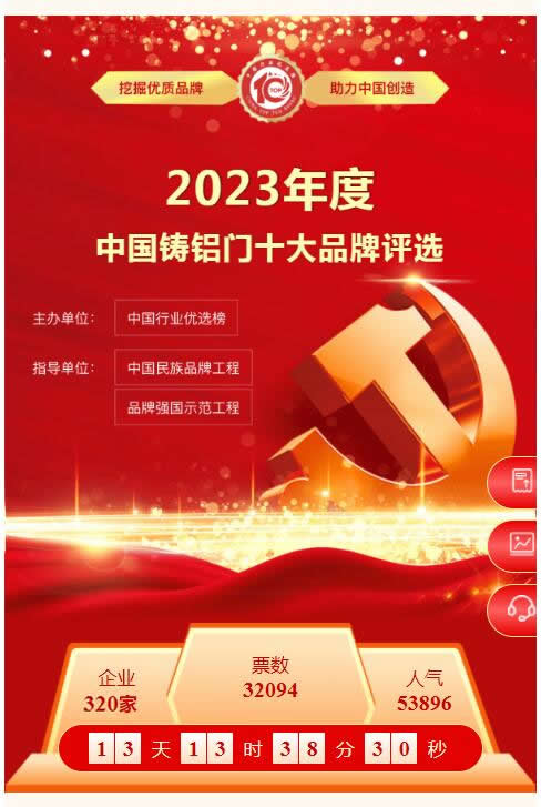- 2023年3月30日,歷時大半個月的2023年度鑄鋁門行業十大品牌評選活動線上投票通道正式關閉。企業之間的票數競爭非常激烈,最終“軍強”過五關斬六將,在