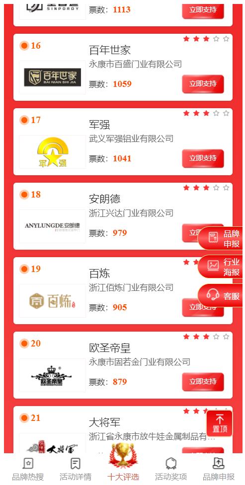 本次網絡評選300余家,囊括國內所有中高端鑄鋁門生產廠家。通過短短幾天時間的投票,武義軍強鋁藝有限公司得到網民的廣大認可,從第17名快速升到第4名,從而顯現出軍強品牌在社會的影響力、知名度以及網民的認可度。
