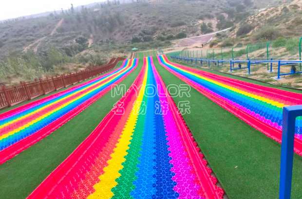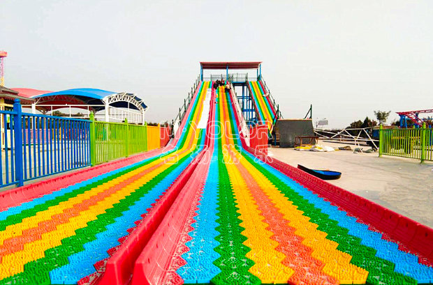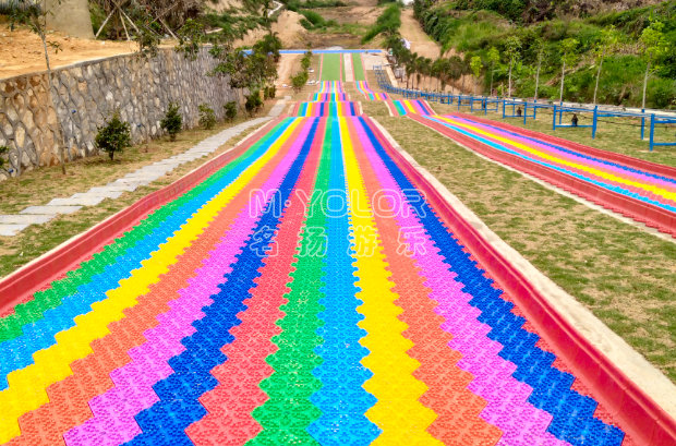 七彩滑道即旱雪滑道、也叫七彩旱雪、七彩雪圈滑道,是旱雪的一款產品,該產品可以根據客戶要求制定顏色,一般會規劃1至4條為宜,兩條至三條為多數的景區選擇,場地基礎建設一般依山體土坡建設或者鋼結構搭建坡度。顏色鮮艷,遠遠望去宛如幾道彩虹傾斜而下,能夠讓人看起來心情愉悅,更加吸引游客,七彩滑道具有施工方便,雪圈潤滑性好,拼接易安裝的特點,可以大大降低施工成本,外形美觀、經久耐用,畫外使用可保證長期艷麗,不褪色。操作簡單,體驗性強,老少皆宜,是景區一個低投資、高回報的景區二消項目。