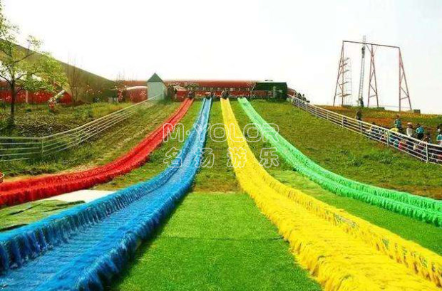 根據地形地質情況依山而建,依靠人造草皮鋪設而成,草場長度一般在100-120m間,其中100m為沖坡、二十米為緩沖坡;坡度一般在30-50度,滑道間距1.5米,可根據場地需求定制不同色彩的滑道.