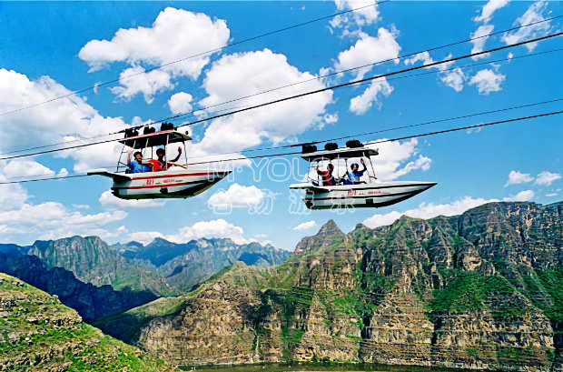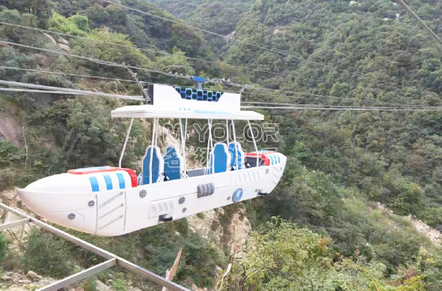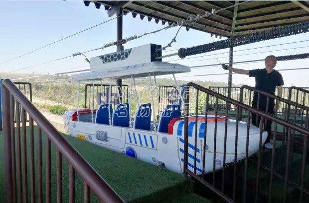 空中飛艇是由張緊機構、牽引機構、飛艇、上下站臺及電氣系統等組成。游客乘坐時,由上下站臺登艇,以最大4m/s的速度沿索道向上站臺慢速運行,在向上站臺運行的過程中,公園美景與城市風光及湖面美景盡收眼底。當飛艇到達上站臺后,以最大8m/s的速度風馳電掣的向下站臺俯沖下去,在接近下站臺時,飛艇減速至1.5~2m/s駛進下站臺并停穩。游客在工作人員的配合下離艇。在整個過程中,使游客有種在空中高速飛行的驚心感覺,極富刺激性、挑戰性、娛樂性,是一種勇敢者的游戲。