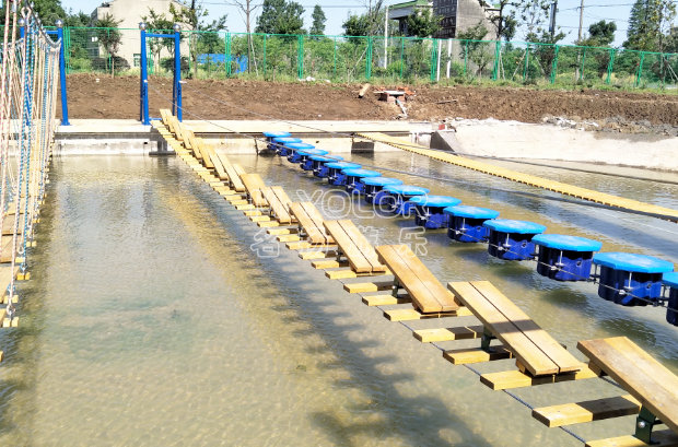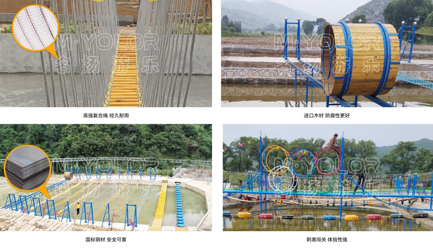 水上拓展是由兩岸水泥基礎(chǔ)上的兩套鋼構(gòu)作為支撐。鋼構(gòu)下方連接鋼索成U型,鋼索間有一定間隔,依托在水上的拓展活動(dòng),水上拓展兼詳細(xì)能和實(shí)踐的綜合素質(zhì)教育,它以運(yùn)動(dòng)為依托,以培訓(xùn)為方式,以感悟?yàn)槟康摹⒔槿胝叩臐撃苓M(jìn)行無窮挖掘,從而讓介入者充分體驗(yàn)挑戰(zhàn)的高興和激情。