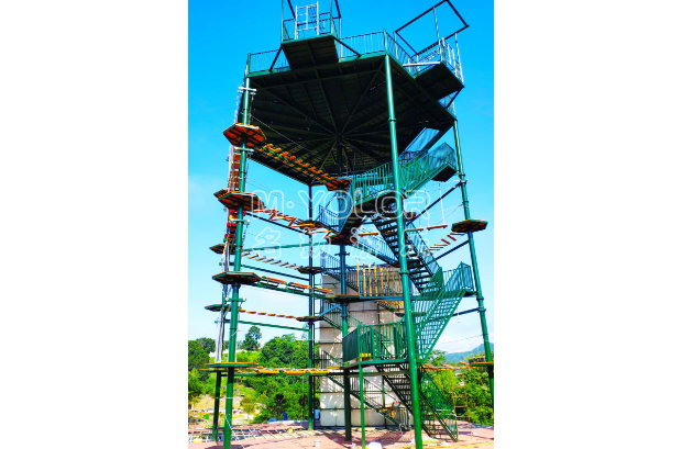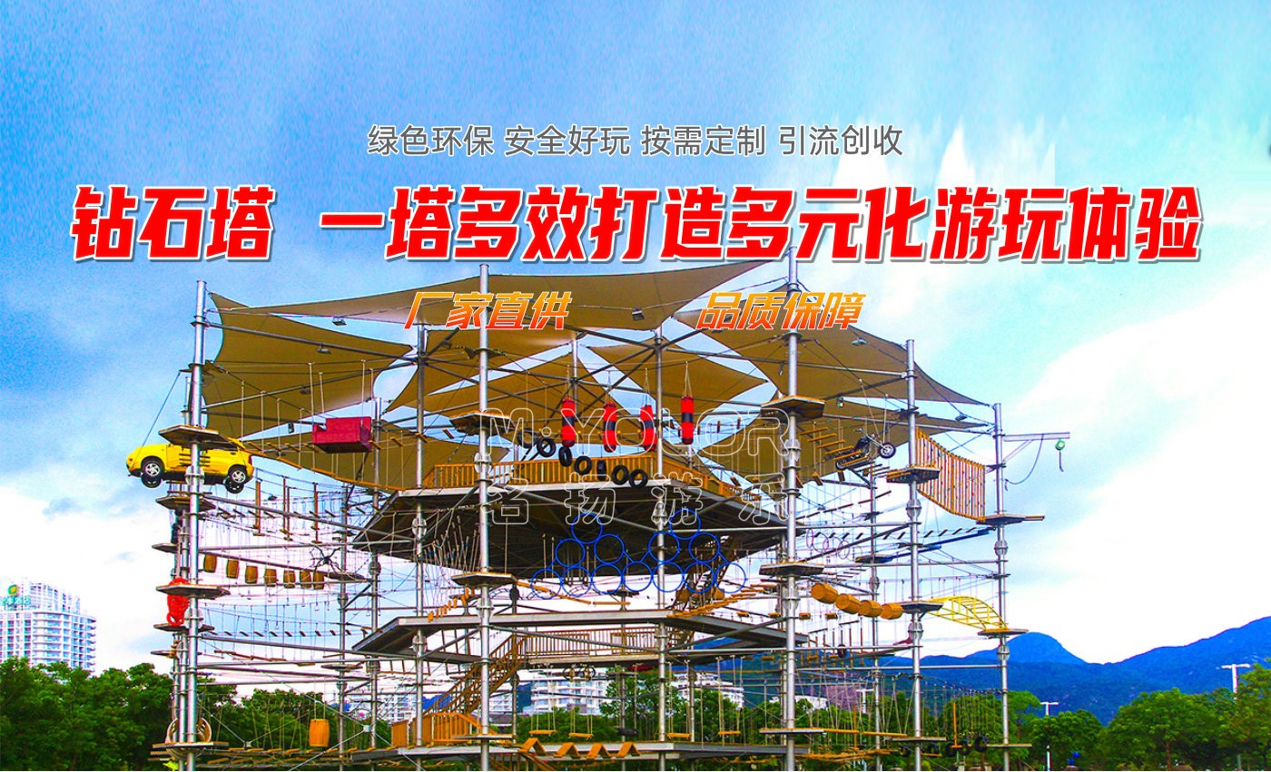 鉆石挑戰塔高空拓展器材-拓展高空架,防止兒童擅自攀爬設計。攀爬設計且符合人體工程學尺寸,攀爬舒適,安全系數高。豪華大方,堅固耐用。學員攀爬防掛繩設計。教練學員分保設計,充分考慮安全需要。學員雙保護,符合國際器材使用標準。斷橋伸縮設計,適用不同人群。