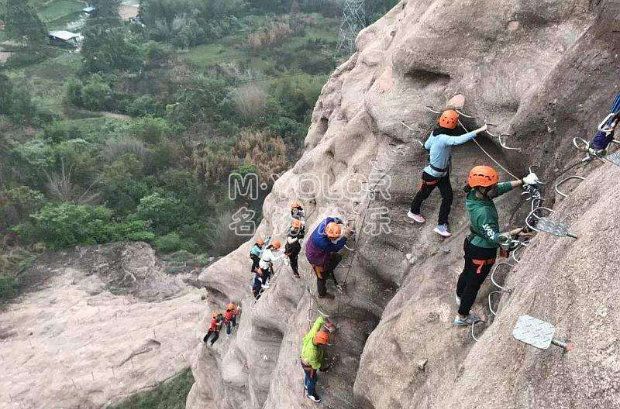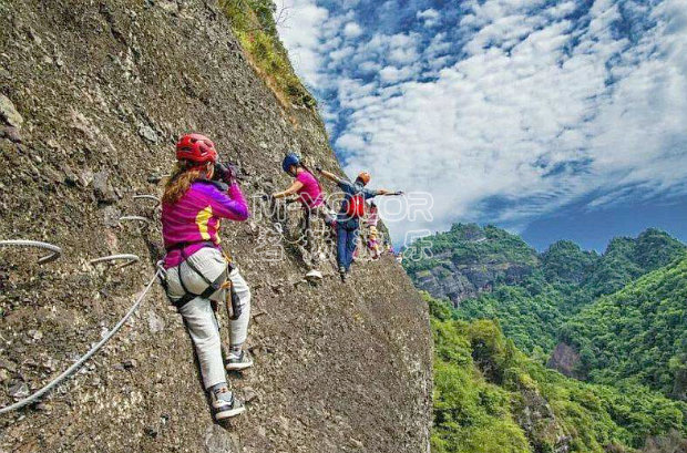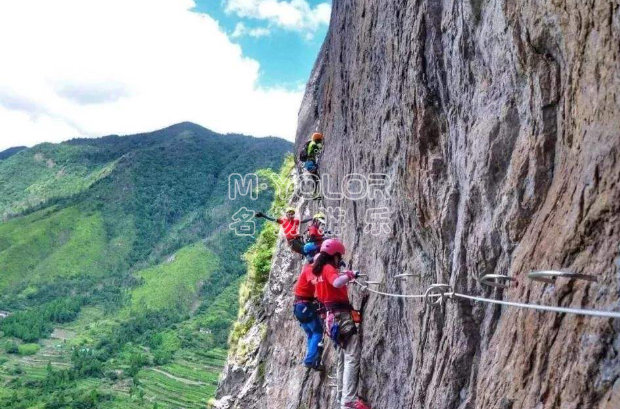 飛拉達是指在山體巖壁上建設,由鋼扶手、腳踏、生命鋼纜等構成的攀登徑道,讓不具備攀巖能力的人也能攀上陡峭的巖壁。保留了野外攀巖的驚險刺激,達到鍛煉體能和意志的目的,同時大大降低了對攀爬者的專業技術要求,在安全有充分保障的前提下,讓普通人也馳騁懸崖,會當凌絕頂,獲得極大的精神享受。