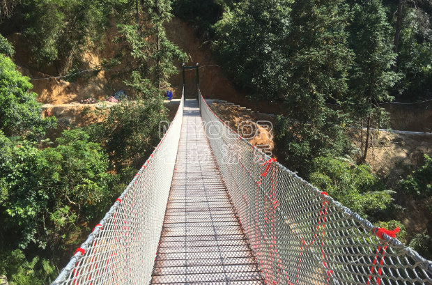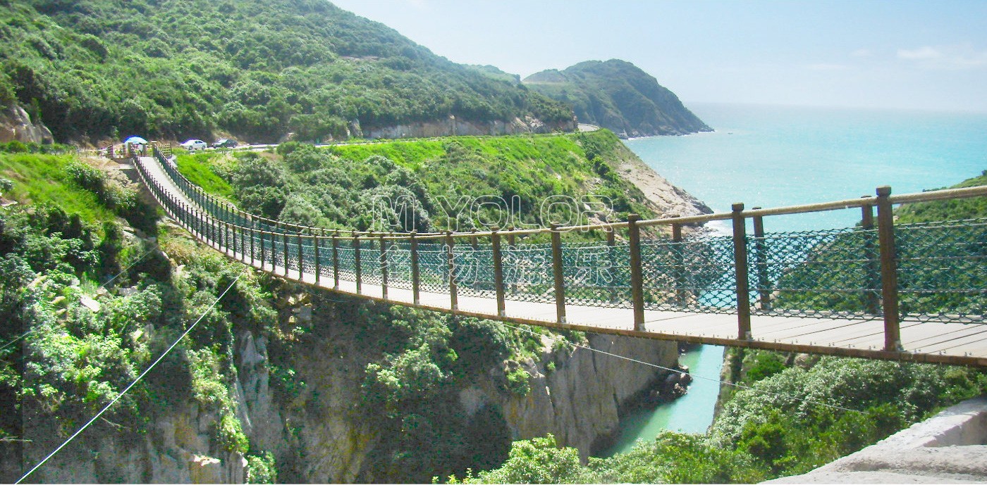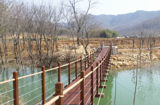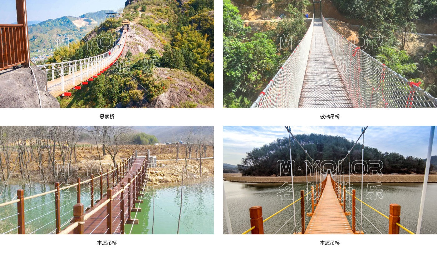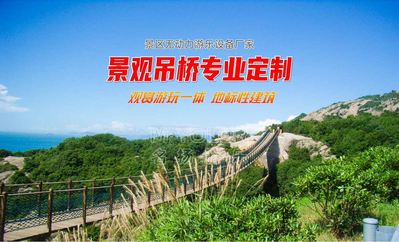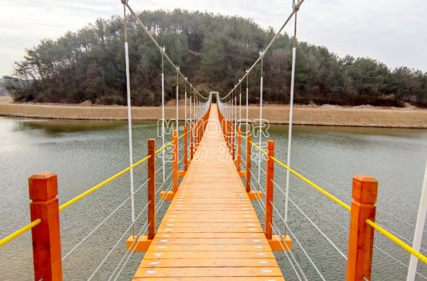 常用于過河或景區景觀設計,其承載索一般位于橋面底部,橋面兩邊扶手采用鋼絲繩或鐵索,橋面底部配有安全網。根據客戶間的要求,同時結合現場具體情況設計建造。此種吊橋的優點在于外表美觀,橋面呈規則弧度,游客走在橋面上微微搖晃,給人的感覺舒服、自在。
